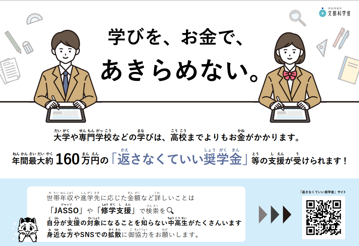 奨学生の募集については、ホームルーム担任から生徒に連絡し、関係文書を教室掲示していますが、ホームページにおいても関係文書を掲載することにいたしました。詳細はホームルーム担任、または奨学金担当者までご相談ください。