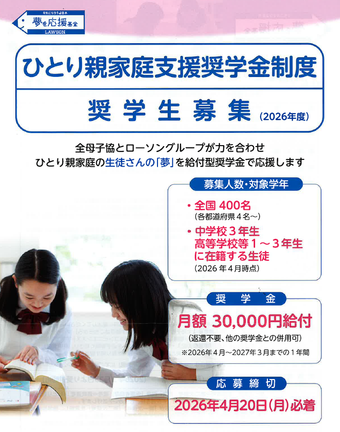 要項・詳細はこちら⇒奨学生募集 全国母子寡婦福祉団体協議会